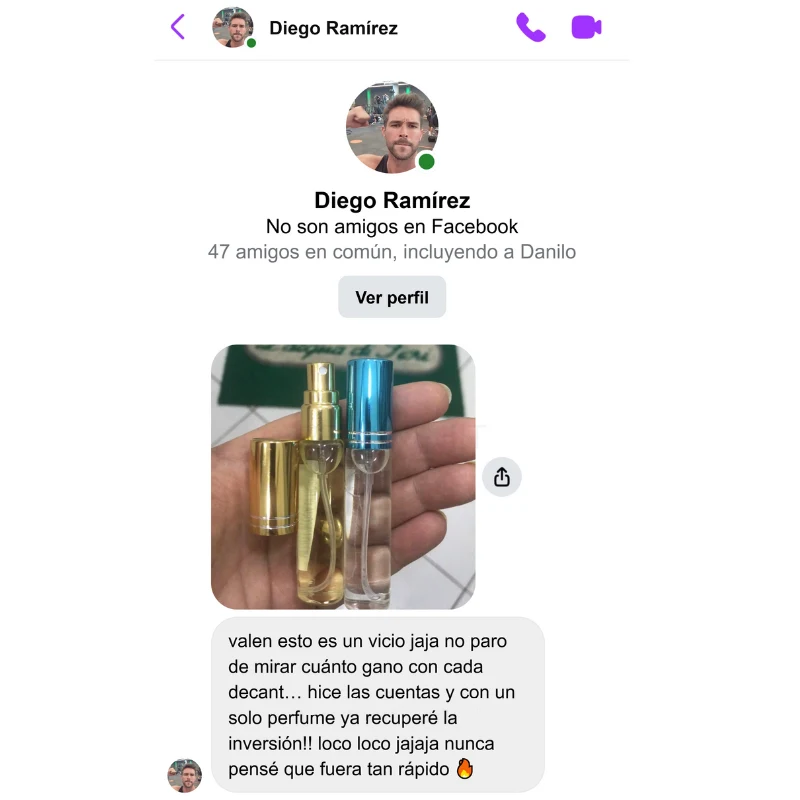 Siempre amé los perfumes, pero los árabes originales eran un lujo imposible. Al descubrir los decants, entendí que no solo podía disfrutar más fragancias, sino también convertirlo en un negocio rentable desde casa.
